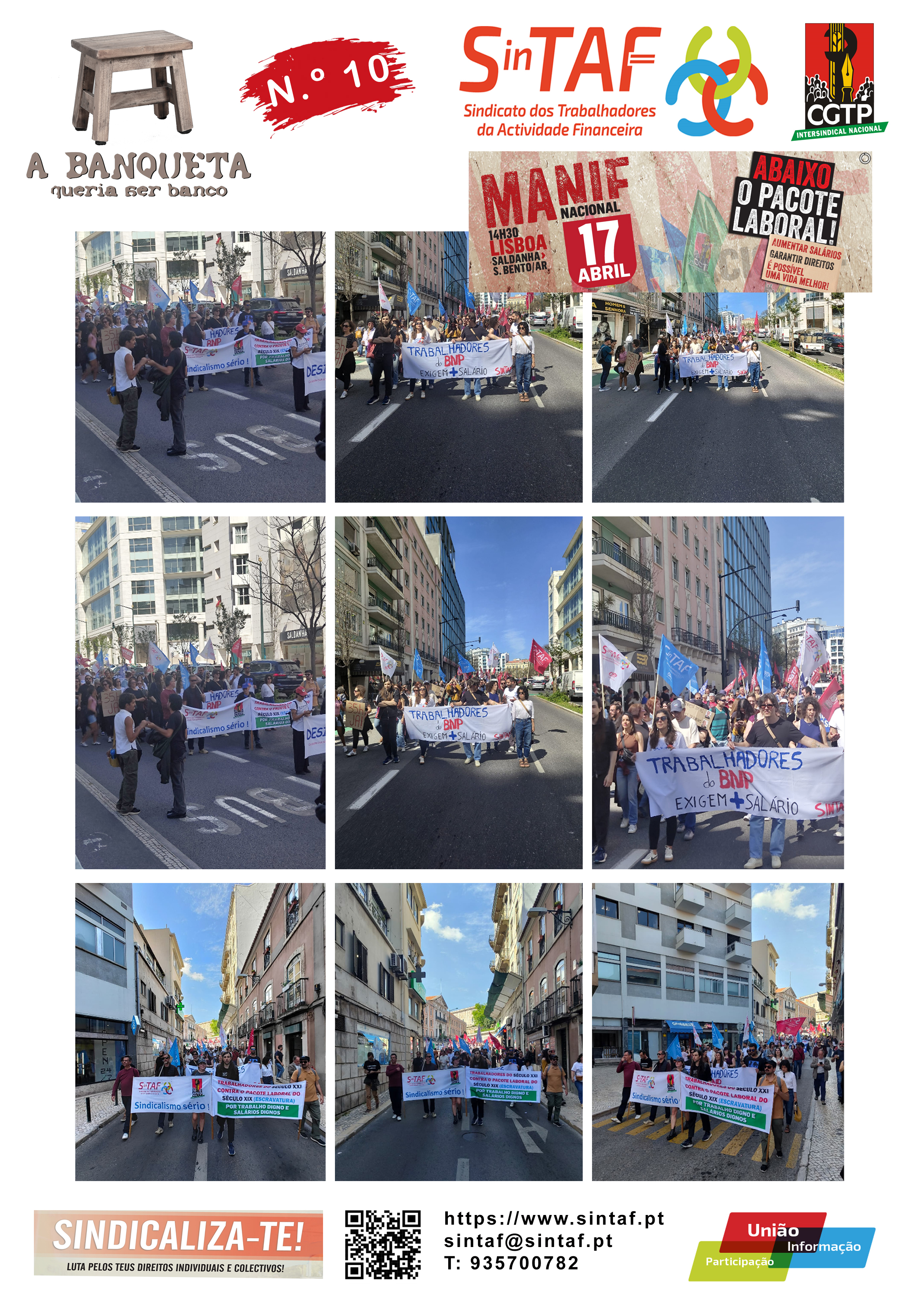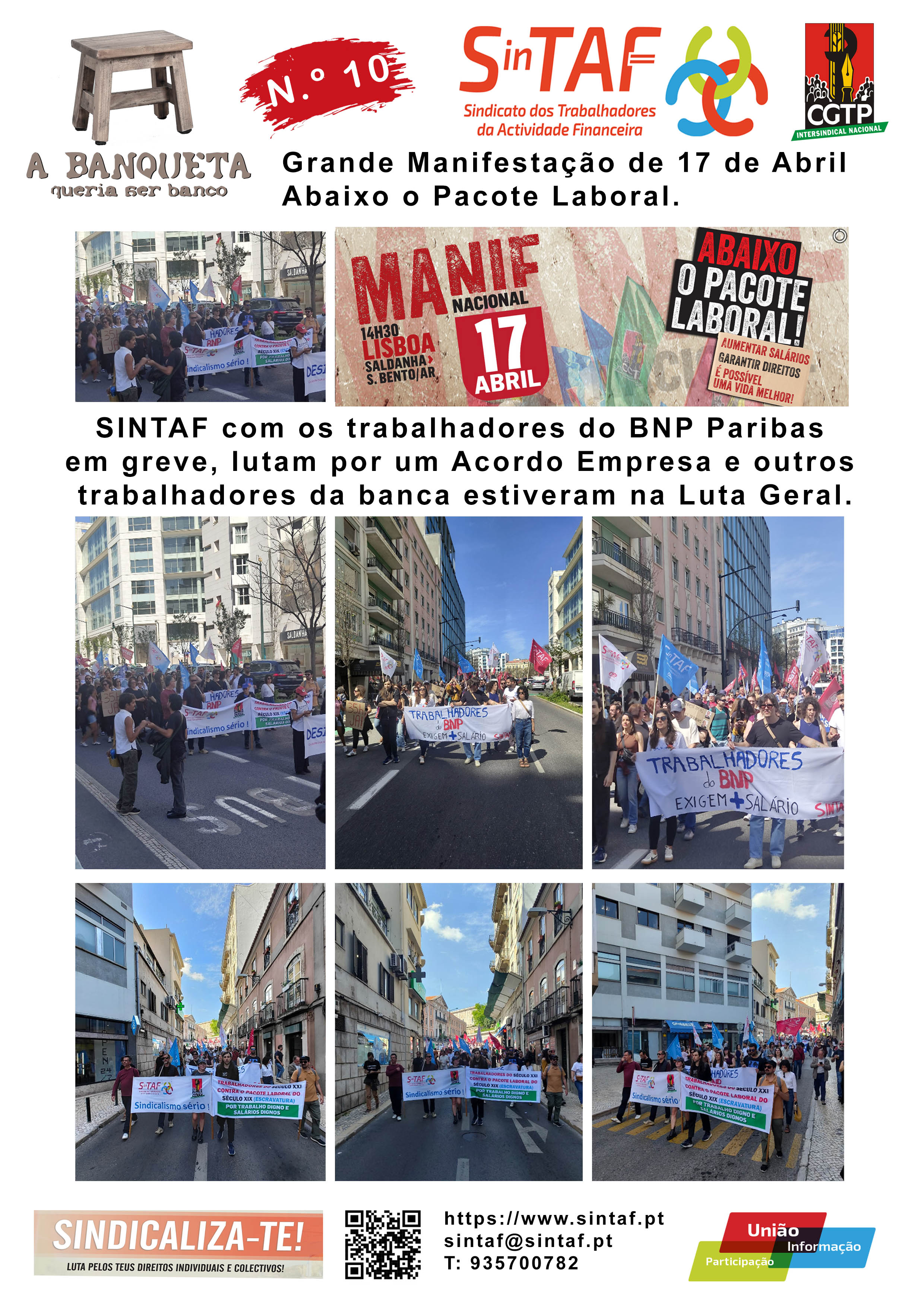 O Sindicato dos Trabalhadores da Actividade Financeira (SINTAF) vem por este meio comunicar ao Ministério do Trabalho, Solidariedade e Segurança Social, à Associação Portuguesa de Bancos, ao Instituto de Seguros de Portugal, às Instituições Financeiras — Bancos, Parabancárias, Companhias de Seguros e a todas as entidades empregadoras do Sector, bem como ao Ministério da Economia e Emprego, ao abrigo do art. 57 da Constituição da Republica Portuguesa e nos termos dos artigos 530. 0 e seguintes do Código do Trabalho, aprovado pela Lei n. 0 7/2009, de 12 de Fevereiro, decidiu o recurso à greve, entre as 00H00 e as 24H00 do dia 17 de Abril de 2026 assim, os trabalhadores abrangidos pelo âmbito deste Sindicato, independentemente da natureza do vínculo e da carreira e categoria profissionais, poderão exercer esse direito e participar na Manifestação Geral definida pela Confederação Geral dos Trabalhadores Portugueses — CGTP-IN, Por Melhores Aumentos Salariais, Por a Negociação Efetiva de Acordos de Empresa que defendam ambas as Partes, Contra o Pacote Laboral — Não ao Retrocesso e à Exploração. Por um Portugal com Futuro, Emprego, Salários, Direitos, Serviços Públicos: