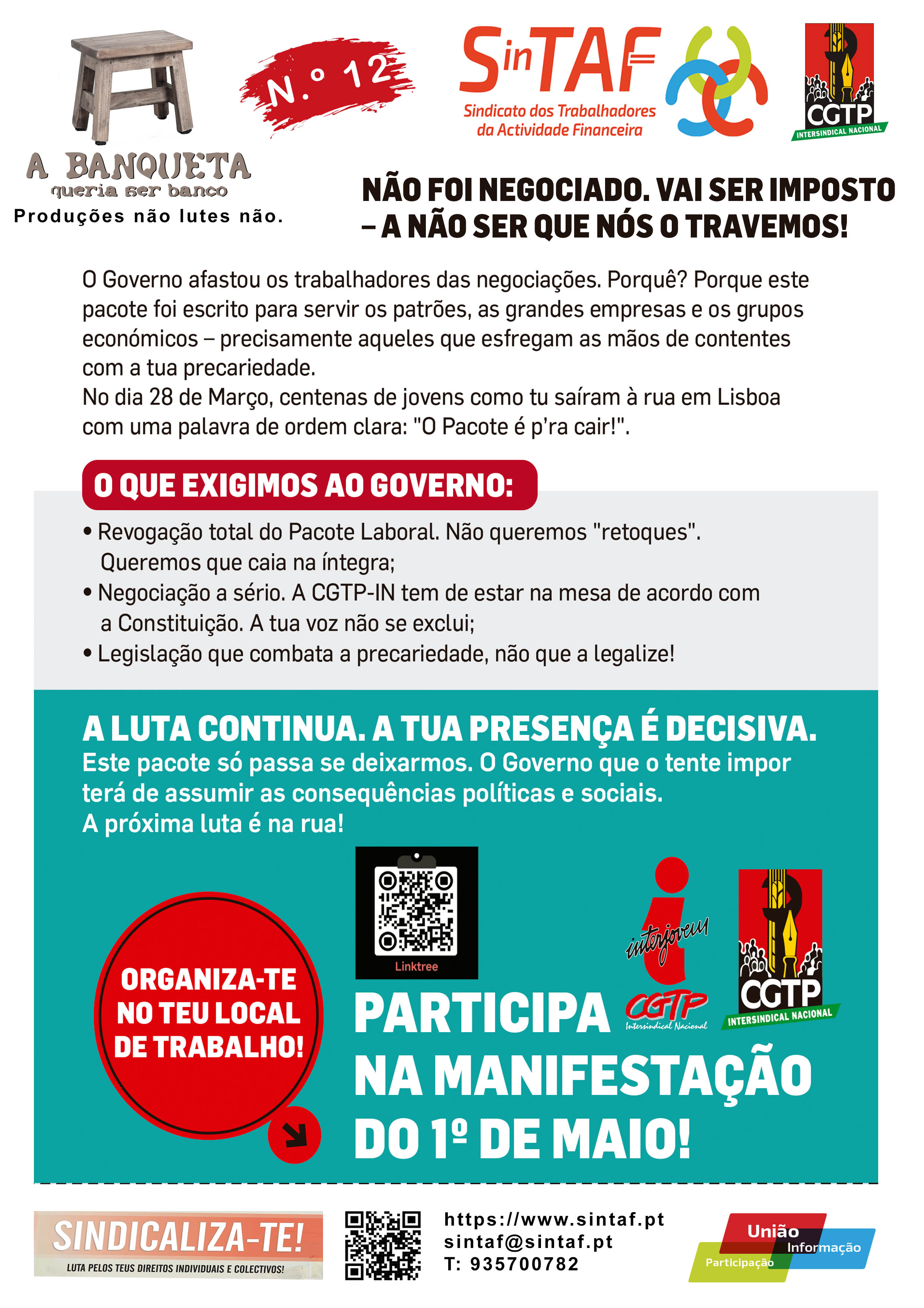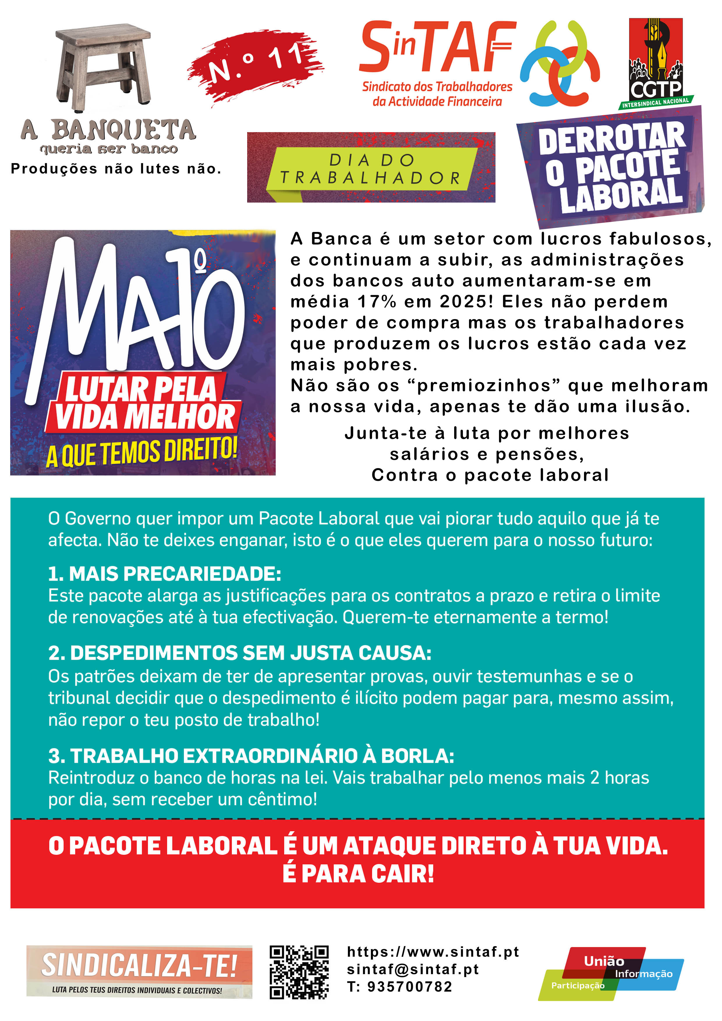 O Sindicato dos Trabalhadores da Actividade Financeira (SINTAF) vem por este meio comunicar ao Ministério do Trabalho, Solidariedade e Segurança Social, à Associação Portuguesa de Bancos, ao Instituto de Seguros de Portugal, às Instituições Financeiras — Bancos, Parabancárias, Companhias de Seguros e a todas as entidades empregadoras do Sector, bem como ao Ministério da Economia e Emprego, ao abrigo do art. 57 da Constituição da Republica Portuguesa e nos termos dos artigos 530. 0 e seguintes do Código do Trabalho, aprovado pela Lei n. 0 7/2009, de 12 de Fevereiro, decidiu o recurso à greve, entre as 00H00 e as 24H00 do dia 17 de Abril de 2026 assim, os trabalhadores abrangidos pelo âmbito deste Sindicato, independentemente da natureza do vínculo e da carreira e categoria profissionais, poderão exercer esse direito e participar na Manifestação Geral definida pela Confederação Geral dos Trabalhadores Portugueses — CGTP-IN, Por Melhores Aumentos Salariais, Por a Negociação Efetiva de Acordos de Empresa que defendam ambas as Partes, Contra o Pacote Laboral — Não ao Retrocesso e à Exploração. Por um Portugal com Futuro, Emprego, Salários, Direitos, Serviços Públicos:
